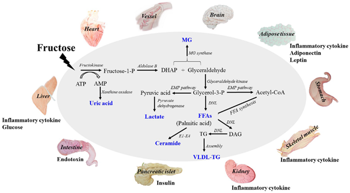Fructose is metabolized differently than glucose. When a hefty load of fructose hits the liver, it bypasses a key regulatory step of glycolysis, and metabolic intermediates are shunted into fatty-acid synthesis (de-novo lipogenesis). This results in a local accumulation of fat, leading to fatty liver and insulin resistance, which wreaks havoc on metabolic health.