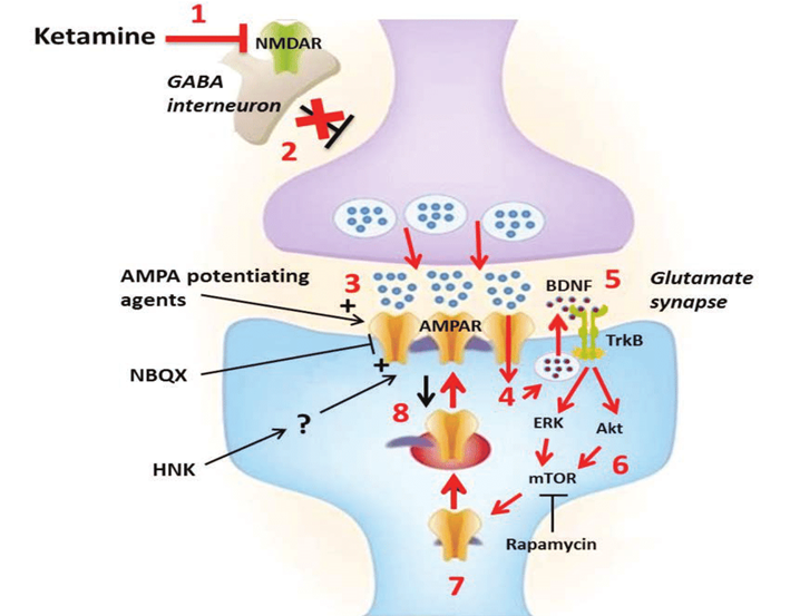 The subsequent burst in AMPA signaling, modulates a number of downstream signaling pathways, including activation of mTOR, and the expression of a host of nerve growth factors such as BDNF or VEGF.